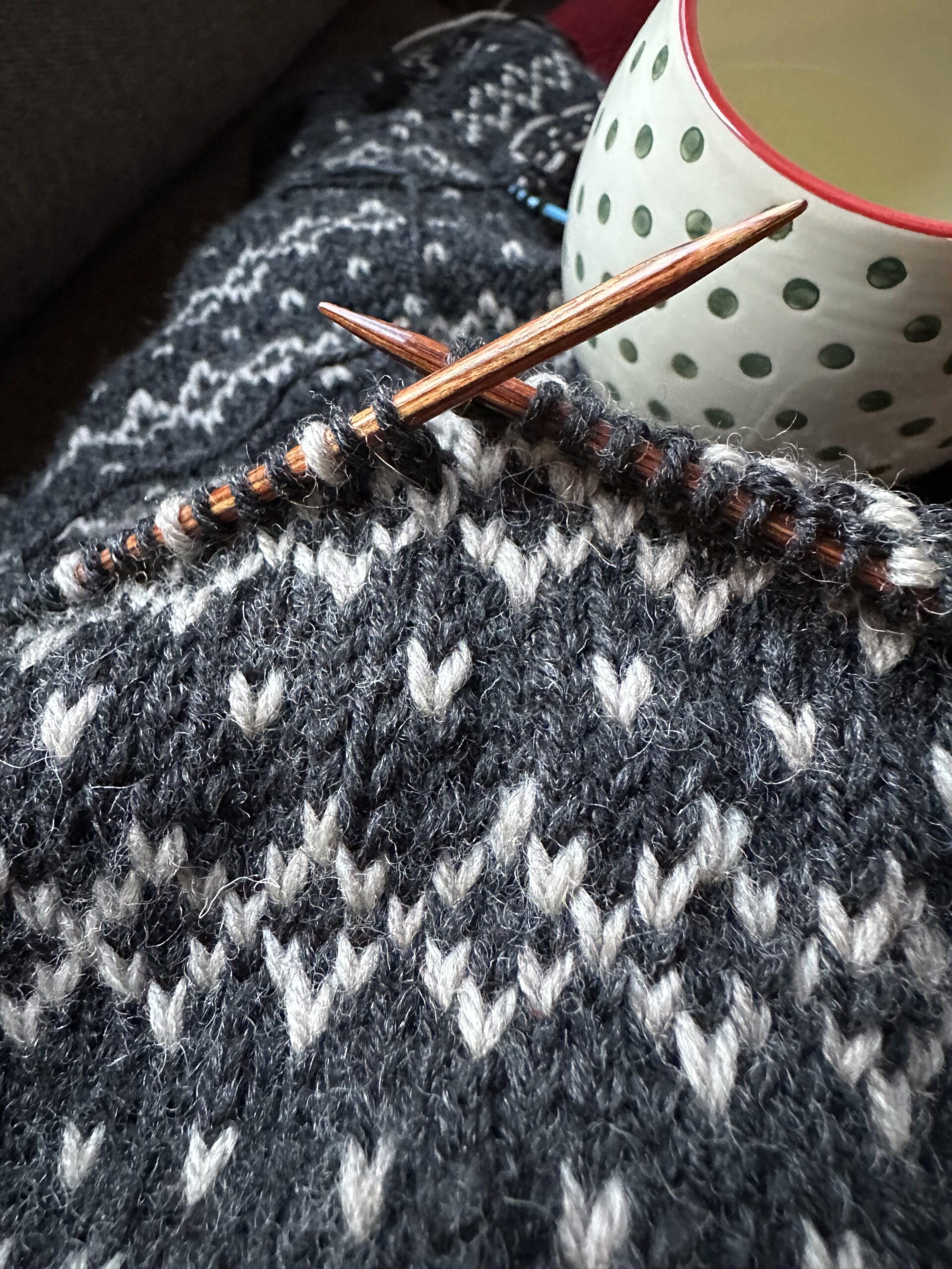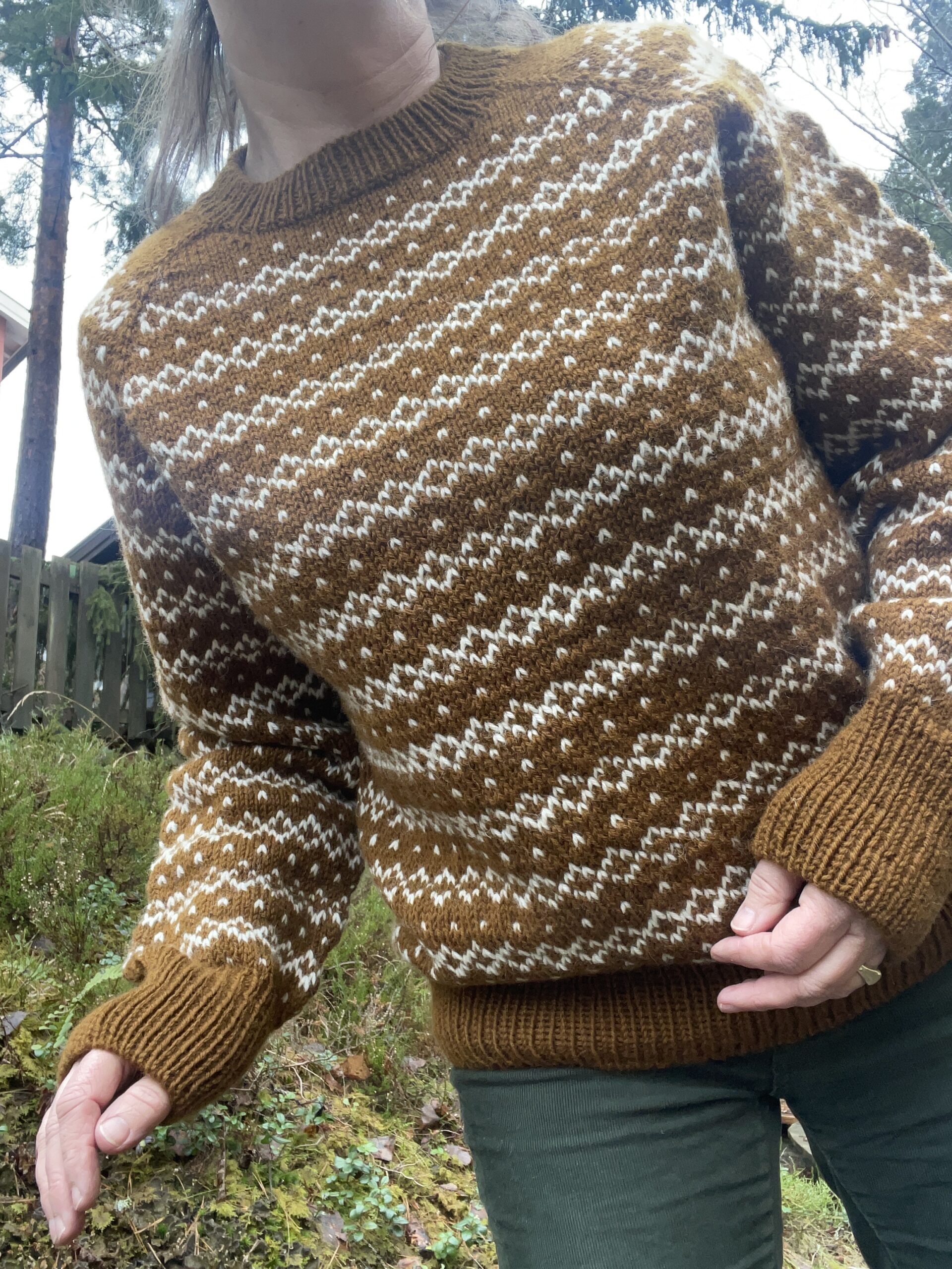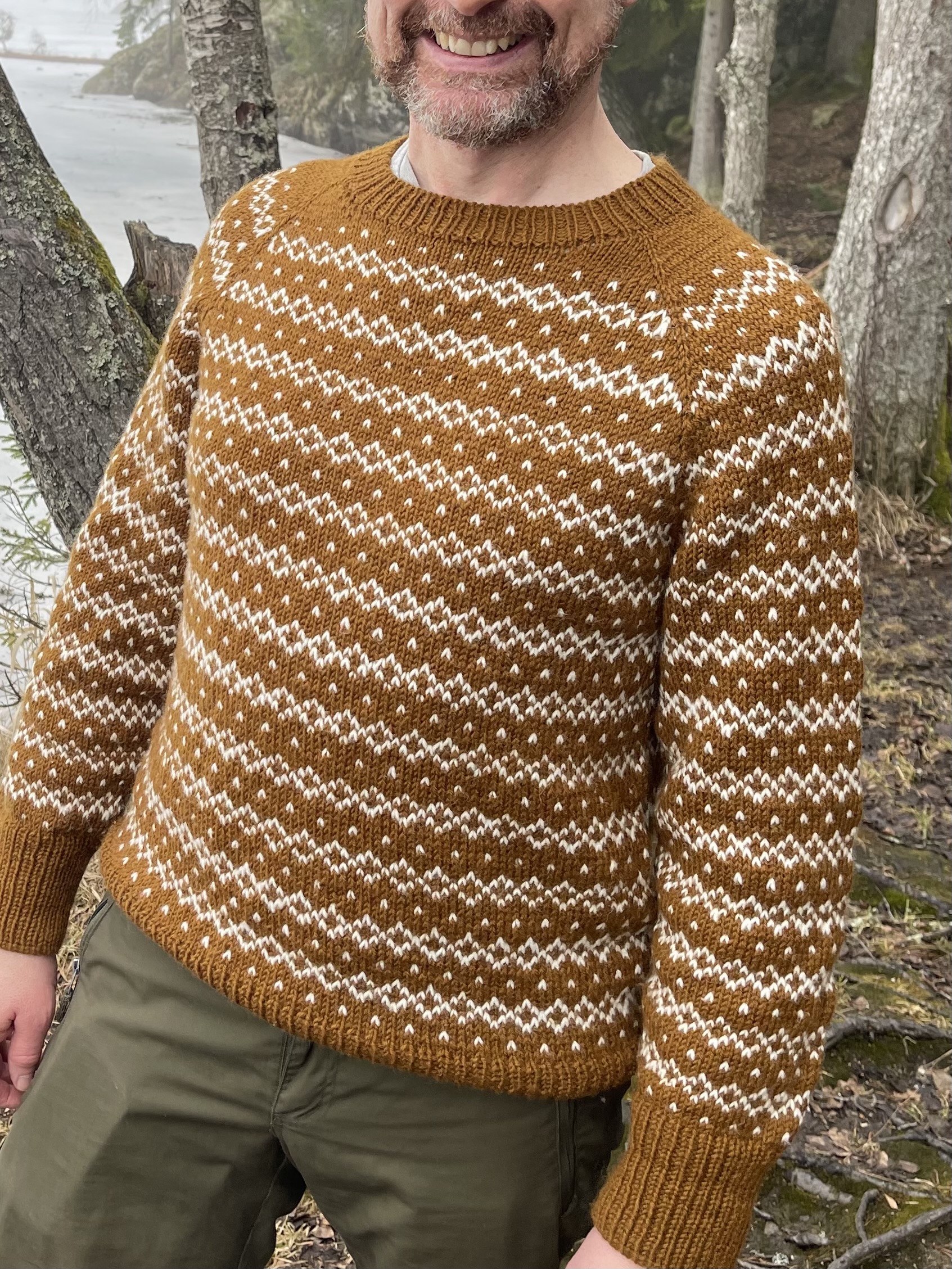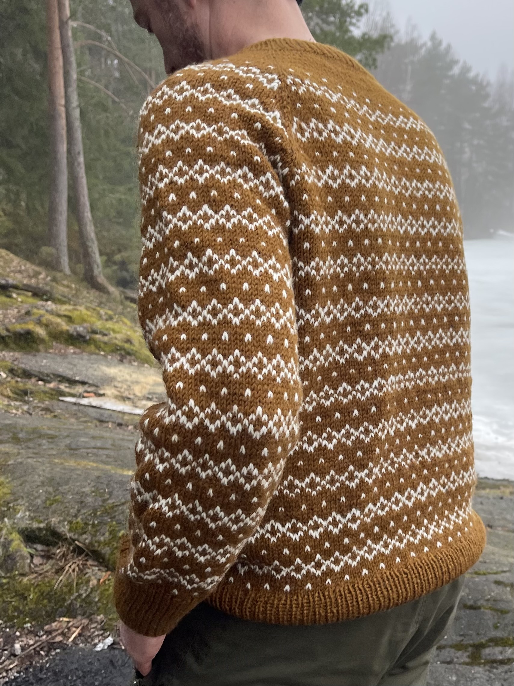 Turgenseren HERRE Dette er oppskrift på en strikkegenser strikket ovenfra og ned uten montering. Halsen er formes ved hjelp av forkortede rader (vendepinner) . Denne genseren har raglanøkning, klassisk fasong og fine, enkle mønsterborder som pryder bol og ermer. Oppskriften er kun på norsk. Den er en digital pdf-fil og lastes ned rett etter betaling Dette er en klassisk turgenser som er middels tykk.  Dette er et enkelt mønster å strikke også for en uerfaren mønsterstrikker. Det er en fordel å ha basiskunnskap i strikking og kunne strikke forkortede rader, raglanøkning, opplegg og felling. Str:  S (M) L (XL) 2XL (3XL) 4XL Overvidde (plaggets mål): 92 (104) 114 (122) 132 (142) 152 cm   Garn: Sandnes garn Peer Gynt 50g =100 m Bunnfarge: 450 (500) 550 (600) 650 (700) 750g Mønsterfarge: 150 (200) 200 (250) 250 (250)250 g   Garnalternativ: Sandnes garn Smart eller tilsvarende garn med samme løpelengde og strikkefasthet.   Pinner: rundpinne 4mm, 40 og 80 cm samt strømpepinner 4mm Rundpinne 3,5 mm, 40 og 80 cm samt strømpepinner 3,5mm Eller pinner som gir riktig strikkefasthet.   Strikkefasthet: 20masker mønsterstrikk og 24 omg = 10×10 cm